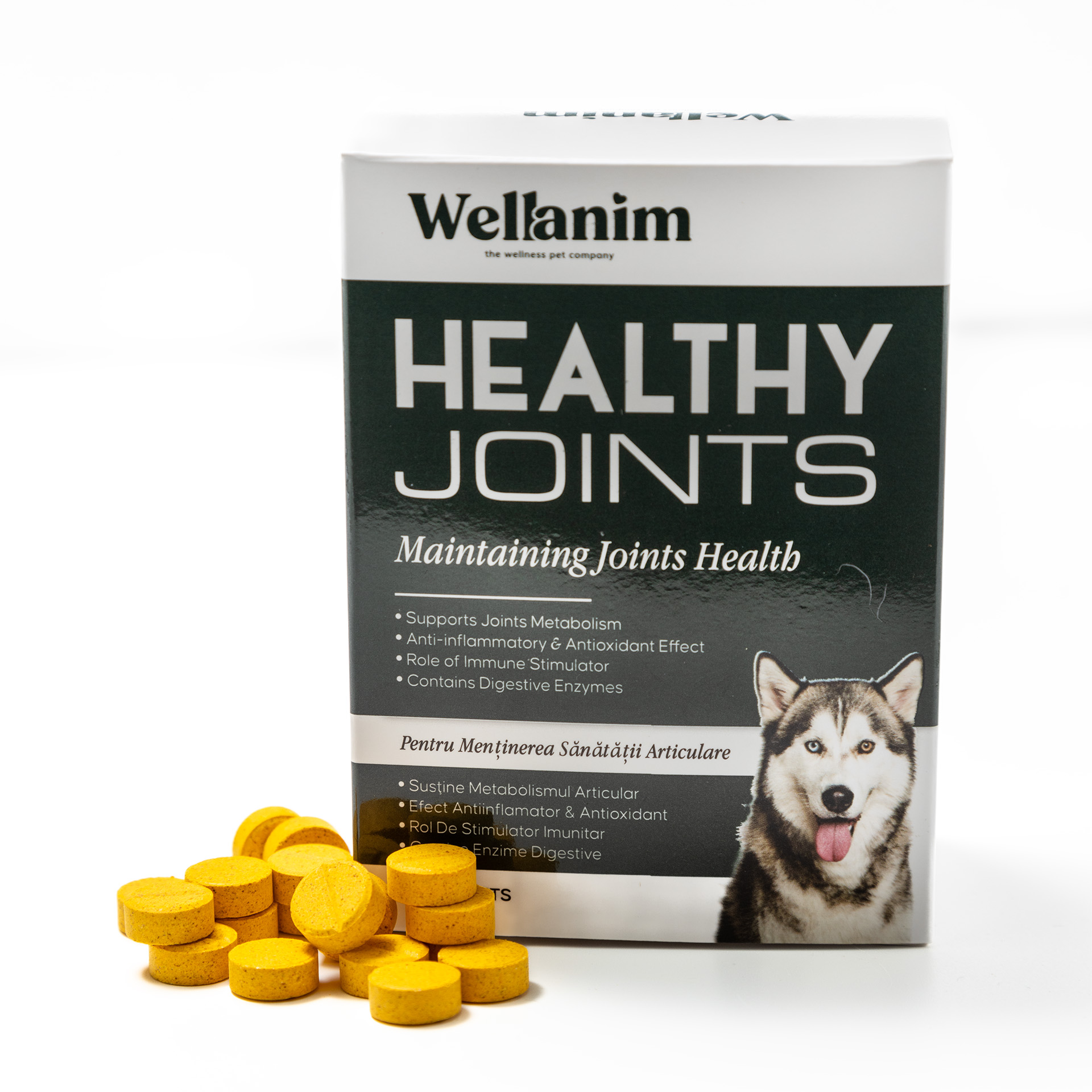HEALTHY JOINTS este o formulă 5 în 1, susţine metabolismul articular prin componenţii naturali cu rol antiinflamator, nutraceutice din structura musculo-articulară, antioxidanţi puternici, stimulatori imunitari şi enzime digestive care optimizează absorbţia nutrienţilor. Îmbunătăţeşte funcţionalitatea şi flexibilitatea articulaţiilor şi şoldurilor prin ameliorarea durerii şi reducerea rigidităţii, contribuie la lubrefierea articulaţiilor, ajută în procesele de reconstrucţie ale tendoanelor, ligamentelor, cartilajului prin promovarea formării de colagen. Exercită un rol esenţial în îmbunătăţirea calităţii vieţii mai ales în cazul câinilor care se confruntă cu probleme articulare sau cei care necesită o îngrijire mai atentă, cum sunt câinii în vârstă sau care se recuperează după diferite leziuni (intervenţii chirurgicale, fracturi, entorse, tendinite, etc).